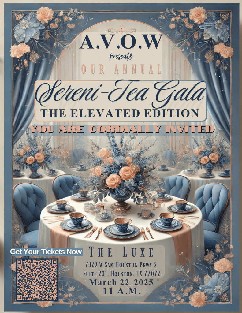Join us for an unforgettable afternoon of elegance, empowerment, and elevation at our AVOW Annual Sereni-Tea Gala: The Elevated Edition! This year, we’re calling women of faith to rise higher, trust deeper, and elevate their faith in God with bold expectation.